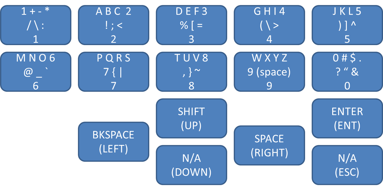 Keypad has 0-9, four directional keys, enter, and escape.