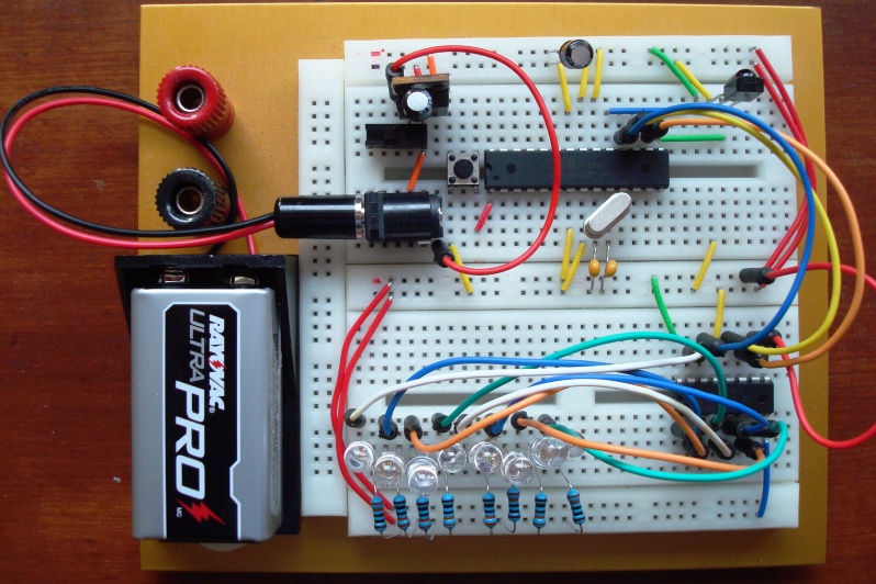Now that you know how a breadboard works, it’s time to learn how to use a breadboard. Before moving on, take a look at the last image. It’s a project I built on a breadboard. There are 8 individual LEDs that will light up and flash different patterns and programmable all via a remote control. Pretty fancy?